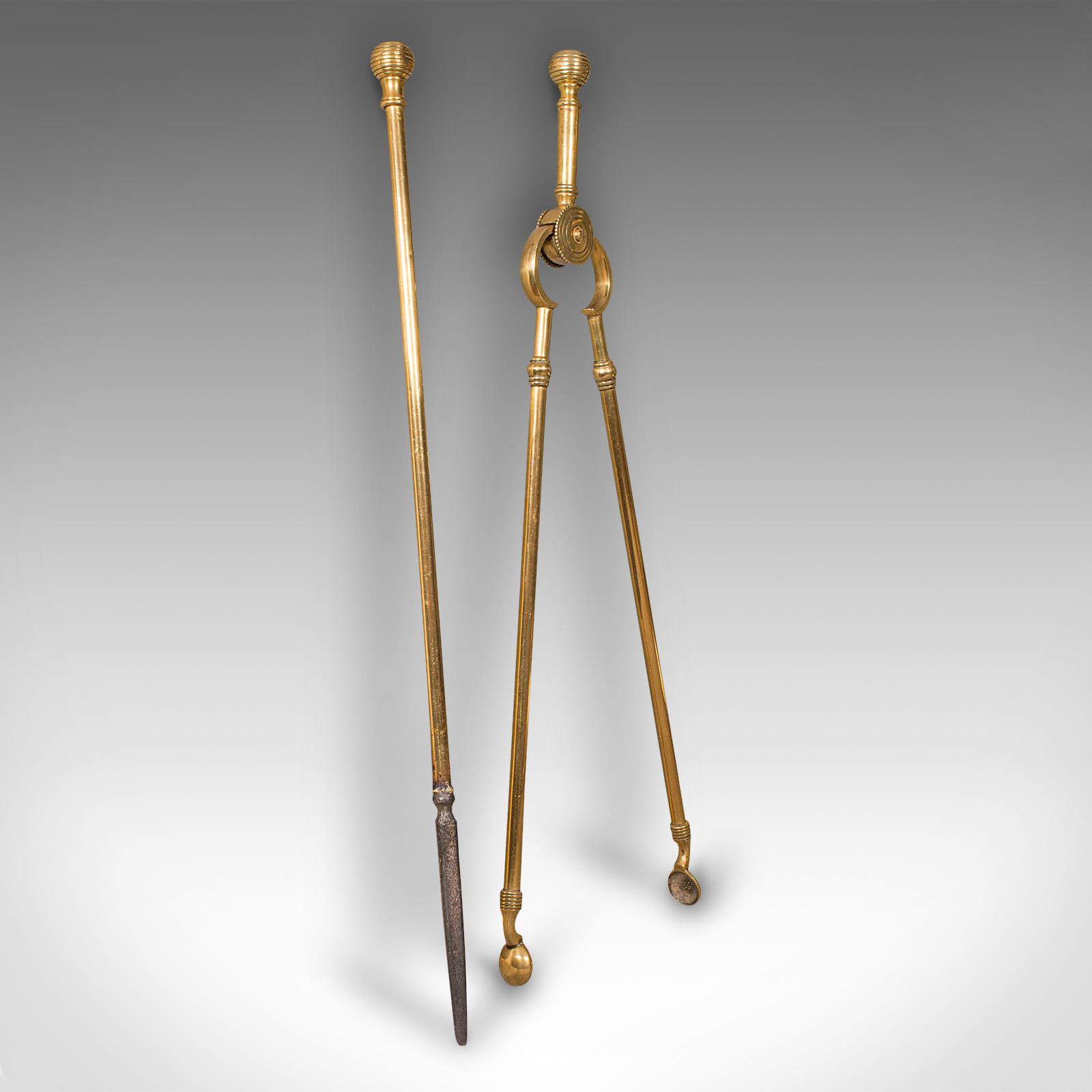 Pair Of Antique Fireside Tools, English, Brass, Iron, Poker, Tongs, Victorian