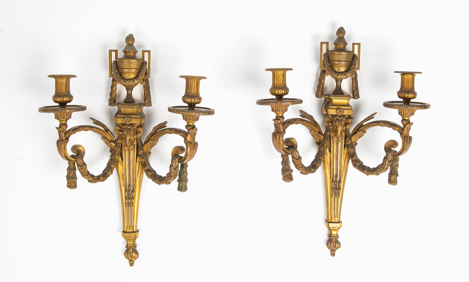 Condition Note: Good antique condition commensurate with age. Original gilt patina. No losses to the casting noted.sconces