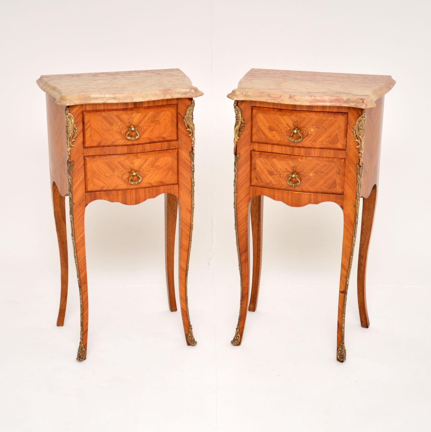 Pair of Antique French Inlaid Marble Top Bedside Chests