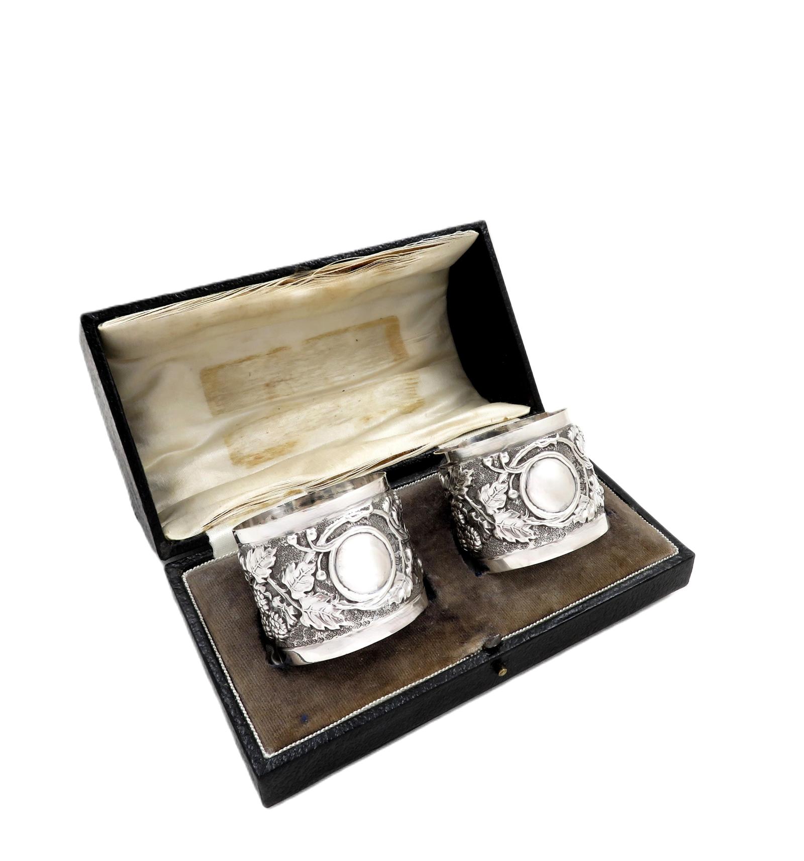 Pair of Antique George V Sterling Silver 'Grape & Vine' Napkin Rings in Case 1911