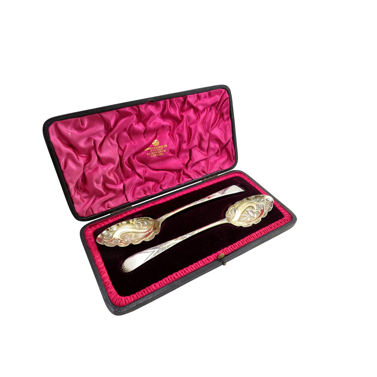 Pair of Antique Georgian Sterling Silver Berry Spoons in Case 1790/1798