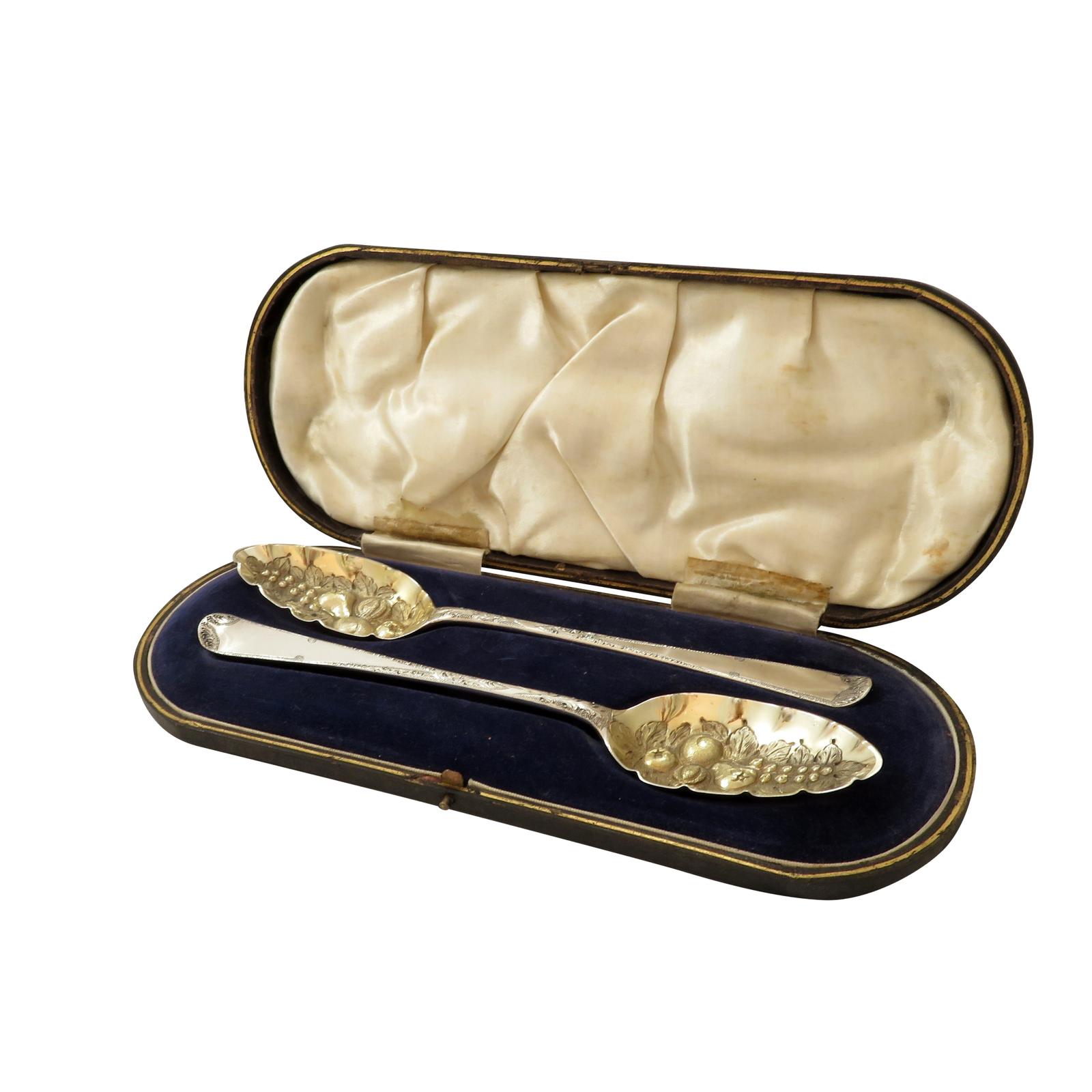 Pair of Antique Georgian Sterling Silver Berry Spoons in Case 1799