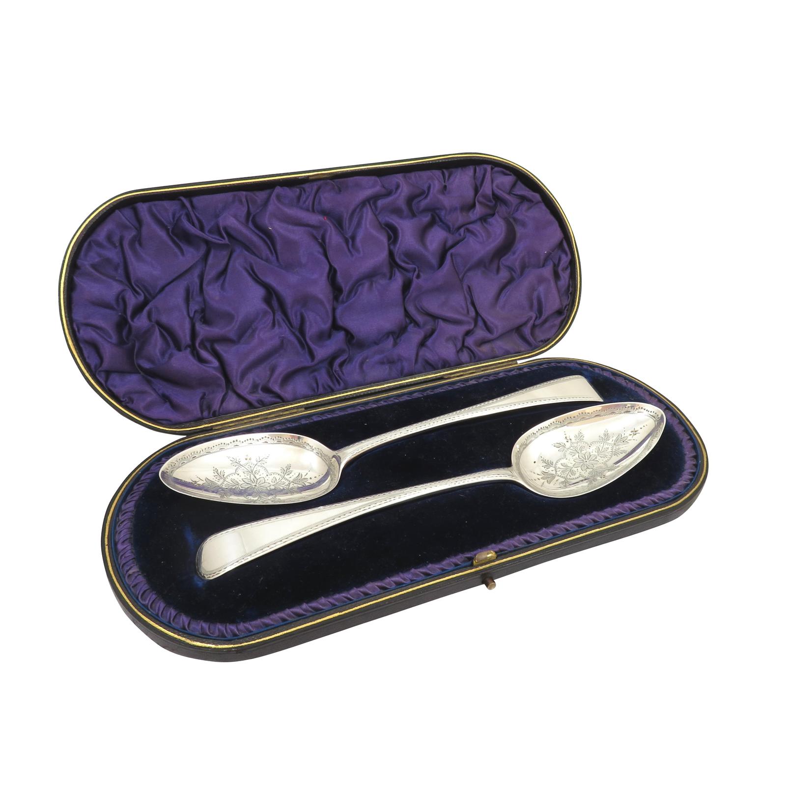 Pair of Antique Georgian Sterling Silver Serving Spoons in Case 1816