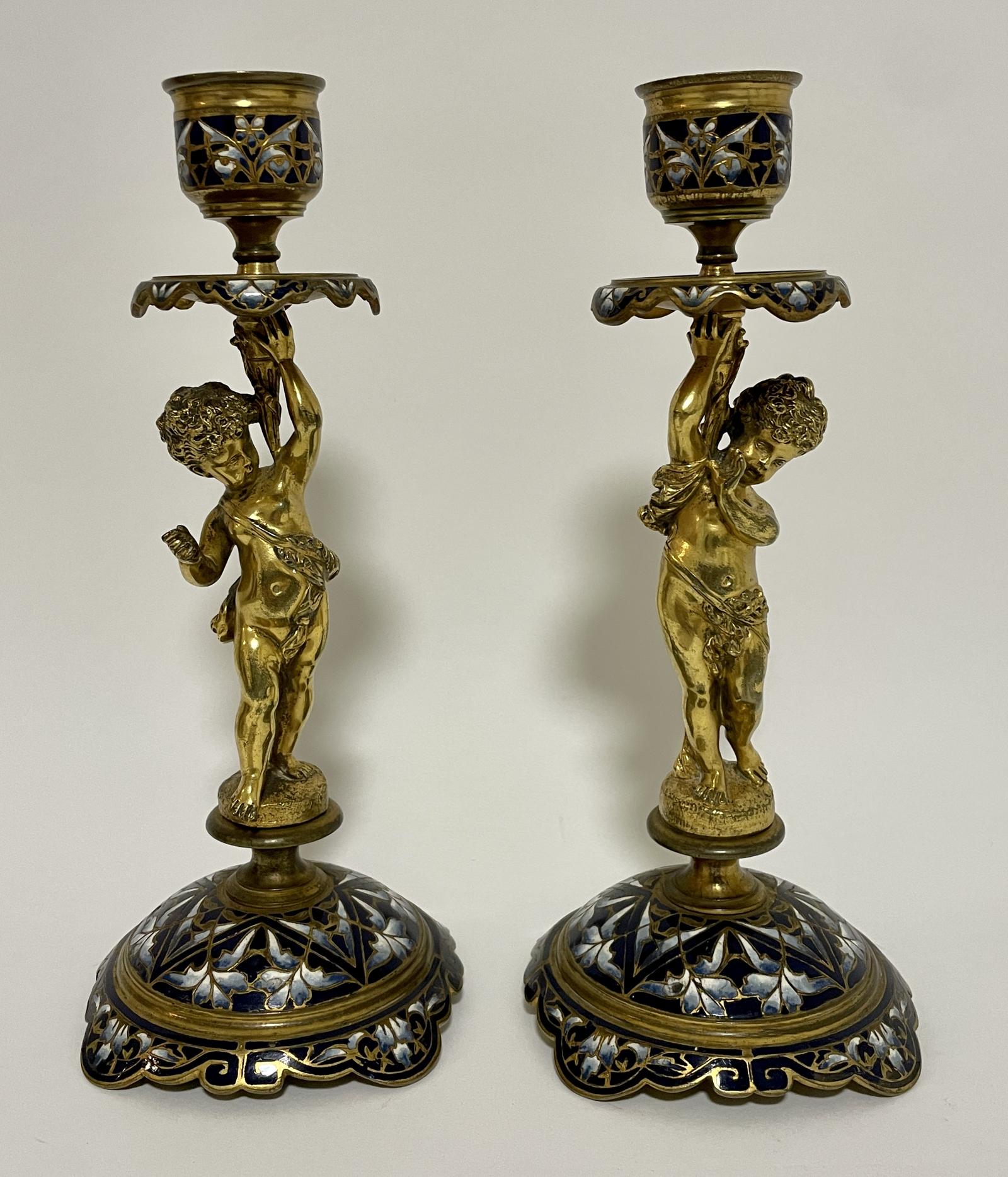 Pair of Antique Gilt & Enamel Putti Candlesticks