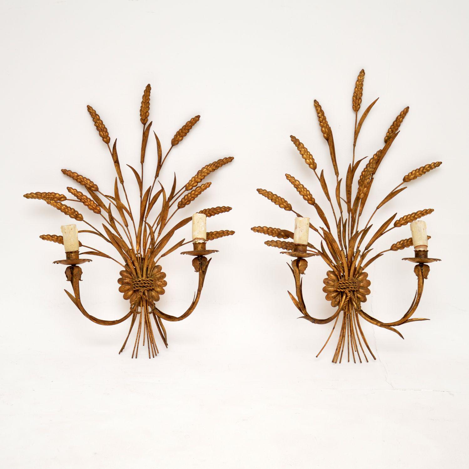 Pair of Antique Gilt Metal Wheat Sheaf Wall Sconce Lamps