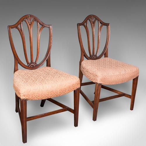 This is a pair of antique Hepplewhite taste side chairs. An English, fruitwood decorative hall seats, dating to the Georgian period, circa 1790. Superb country house appeal with the distinction of the Hepplewhite influence, displaying a desirable aged patina, lightly time worn with age and gentle use. Delightful frames crafted in fruitwood and presenting deep caramel hues. Pleasingly overstuffed cushions with a plump, generous seat. Striking shield backs, with prominent crest rail and distinctive back splats. The crest and lower rails accentuated with relief carvings. Seat set at a comfortable height of 47.5cm (18.75''). Upholstery ready to be enjoyed as-is for the country house look. It could benefit from recovering to personal taste. Standing upon gently tapering square legs, united at the front and side with stretchers. This is a fascinating pair of antique Hepplewhite taste side chairs, ready to accentuate a reception hall of a fine country house, or accents at the side of a room. Solid joints and construction, delivered ready for the home. We offer a 100% satisfaction guarantee with all of our antiques. Please contact us if you require any further information - we are here to help.