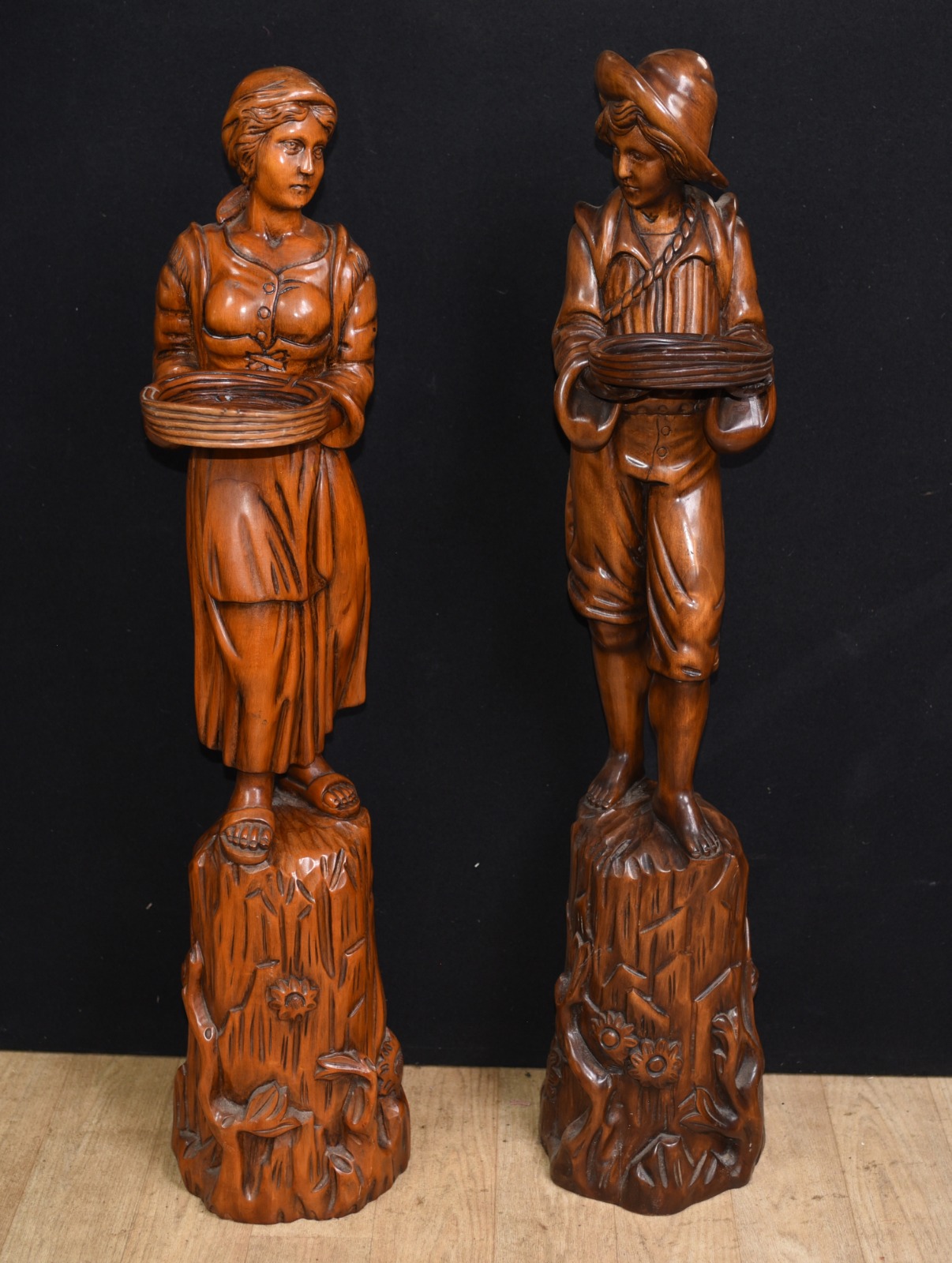 Pair of Antique Italian Walnut Carved Figures Stands 1890