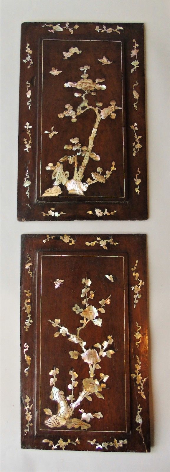 Pair of Antique Japanese Inlaid Mother of Pearl Hardwood Panels