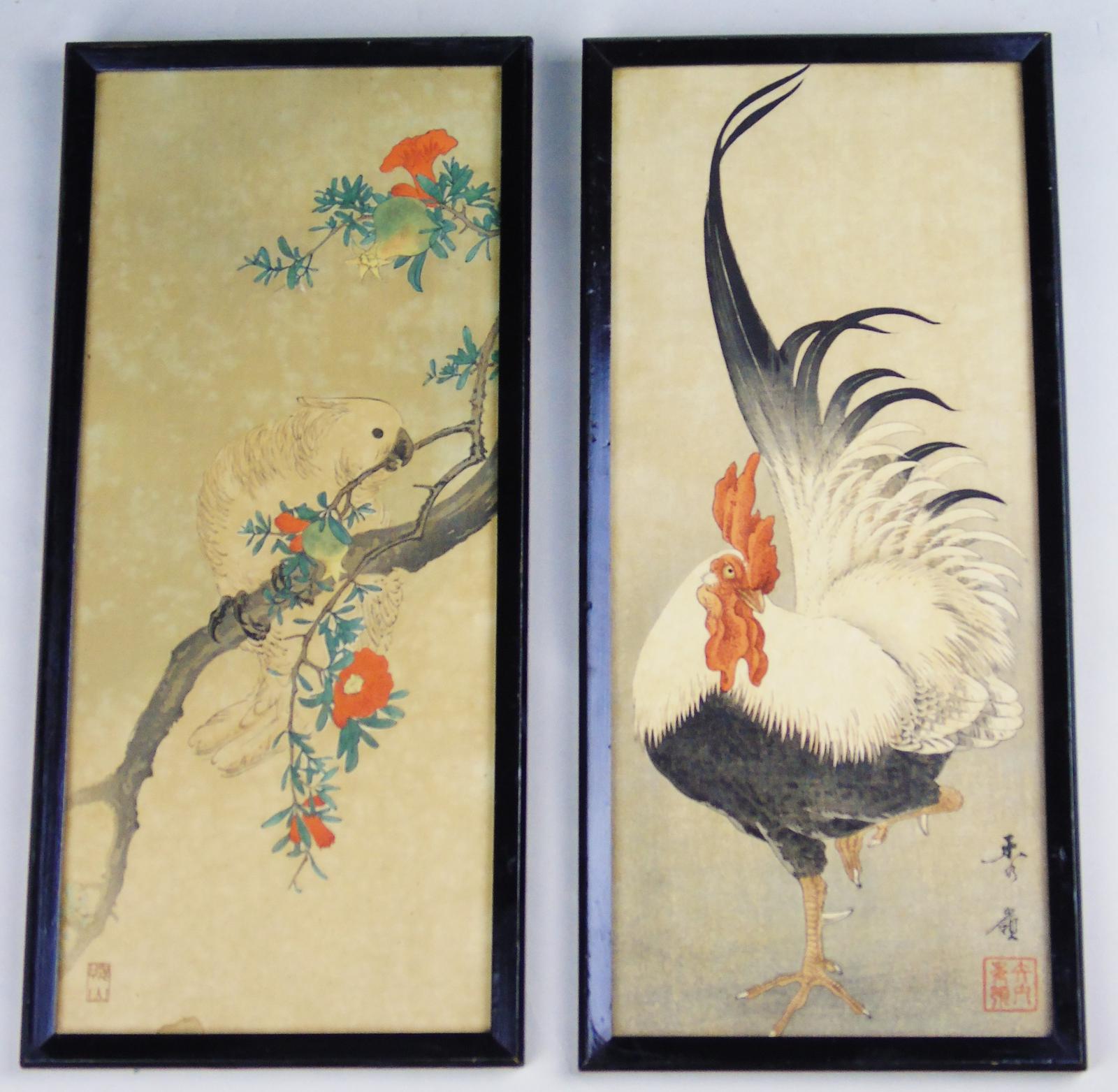 Pair of Antique Japanese Signed Woodblock of Cockerel & Cockatoo Nakagawa Shurei