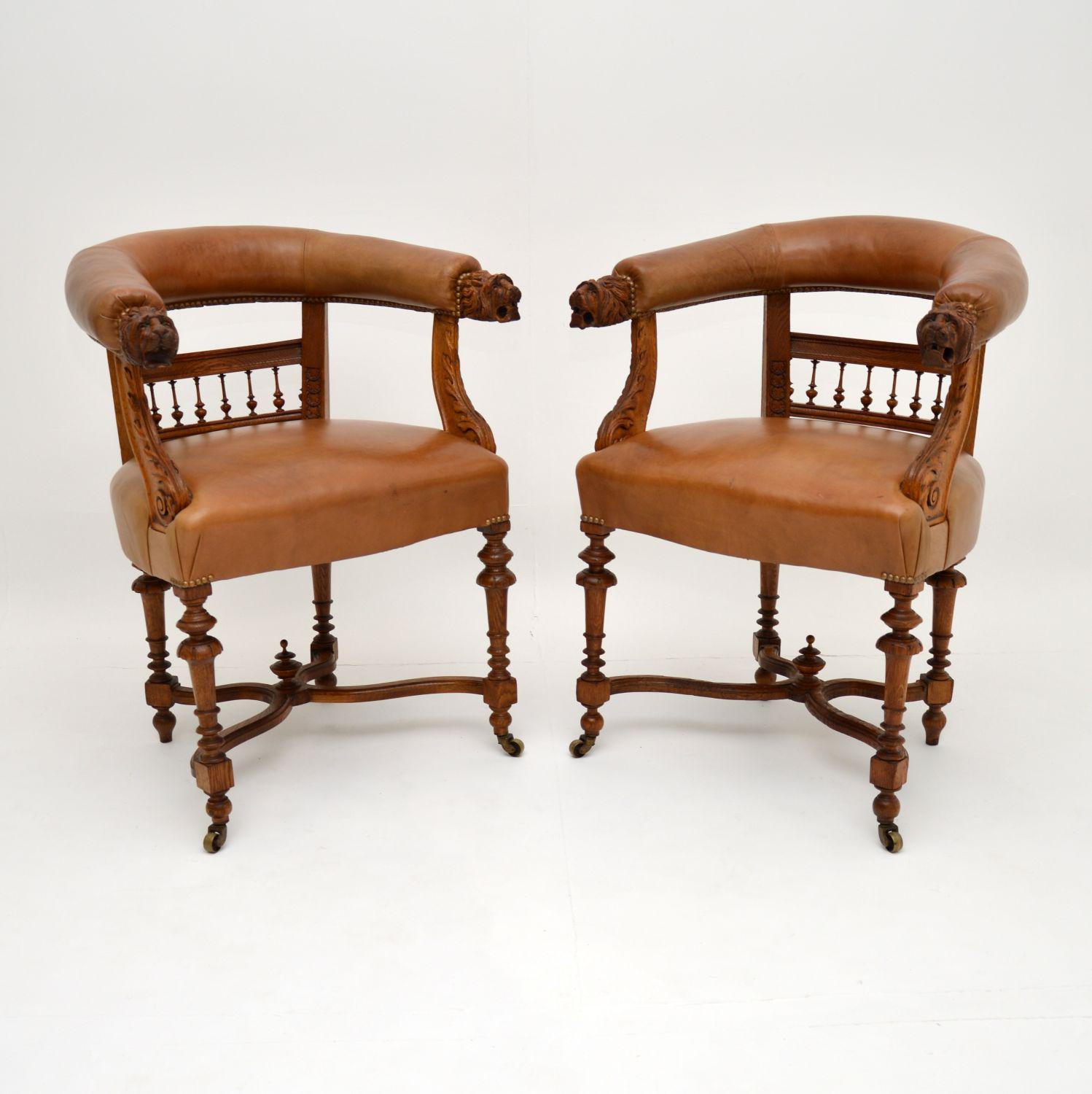Pair of Antique Leather & Carved Oak Armchairs (1 of 12)