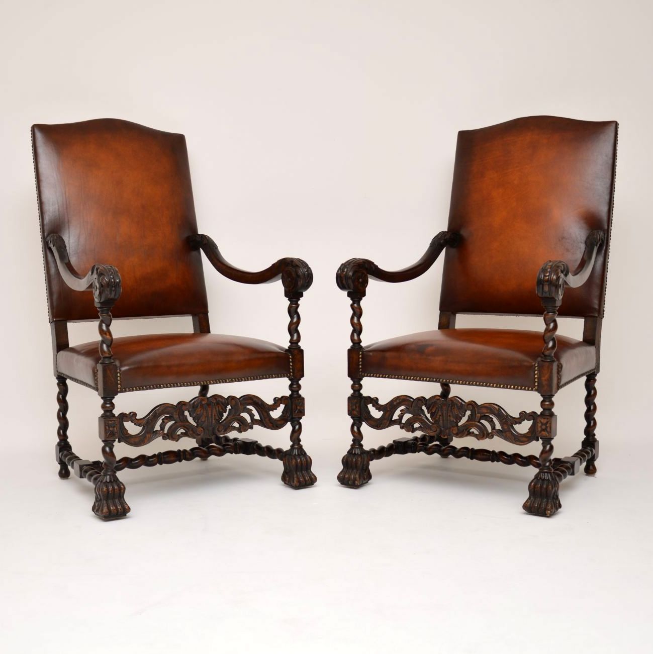 Pair of Antique Leather Upholstered Carved Oak Carolean Armchairs