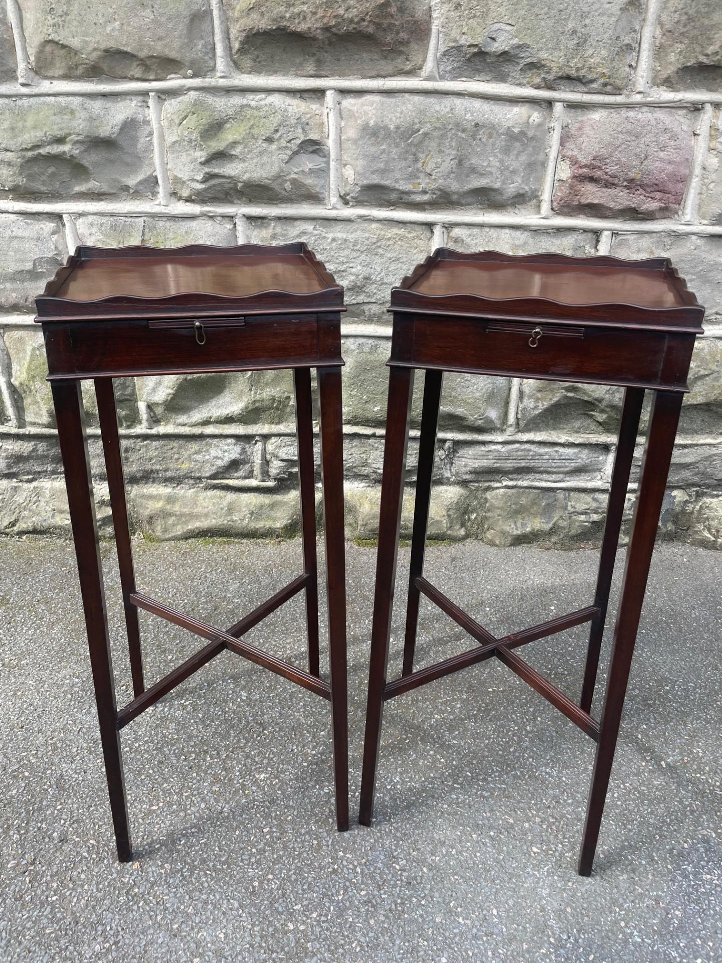 Offered for sale is this good pair of antique mahogany kettle stands/bedside tables. In mahogany having shaped gallery tops, pull out slides, standing on slender square tapering legs with a cross stretcher.