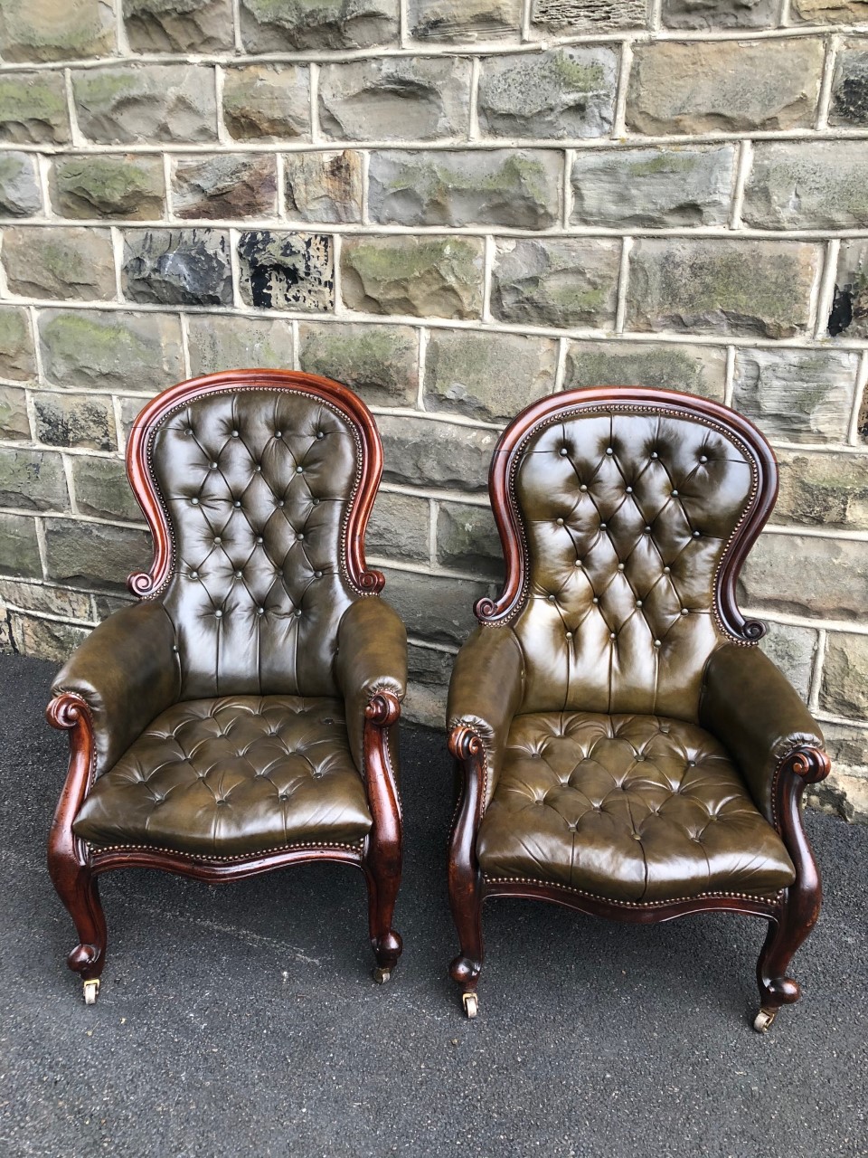 Pair of Antique Mahogany & Leather Library Armchairs