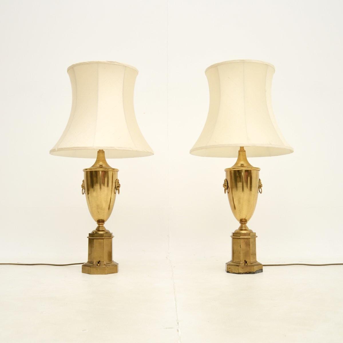 A stunning pair of antique neoclassical brass table lamps. They were made in England, they date from around the 1930’s. The quality is outstanding, the solid brass lamp bases have a beautiful urn shaped design with lions head ring pull handles on the sides. They are a large and impressive size, especially with the cream silk shades, which are also large and of superb quality. They are in excellent condition, with only some minor surface wear here and there, seen in the images. They have been recently re-wired and are in good working order. Width base – 6 inches , 15 cm Width shade – 16 inches , 41 cm Height to socket – 21 inches , 54 cm Height to shade – 32 inches , 81 cm