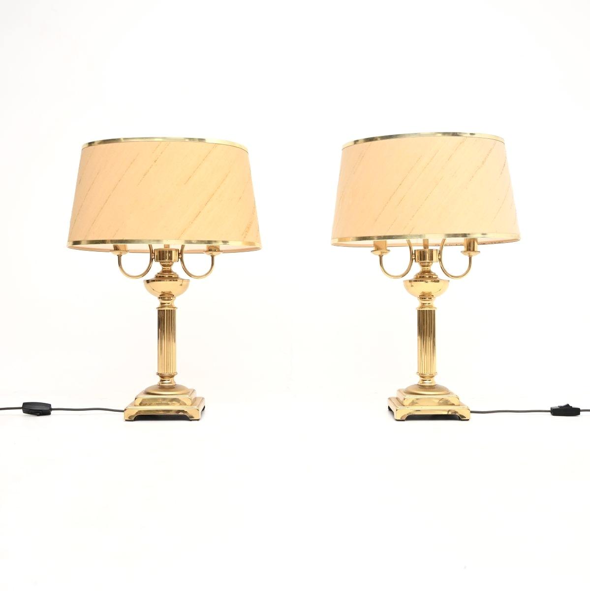 A lovely pair of antique neoclassical style brass table lamps, made in England and dating from around the 1960s.