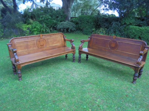 Pair of Antique Oak Country House Hall Seats / Bench Settle c.1860