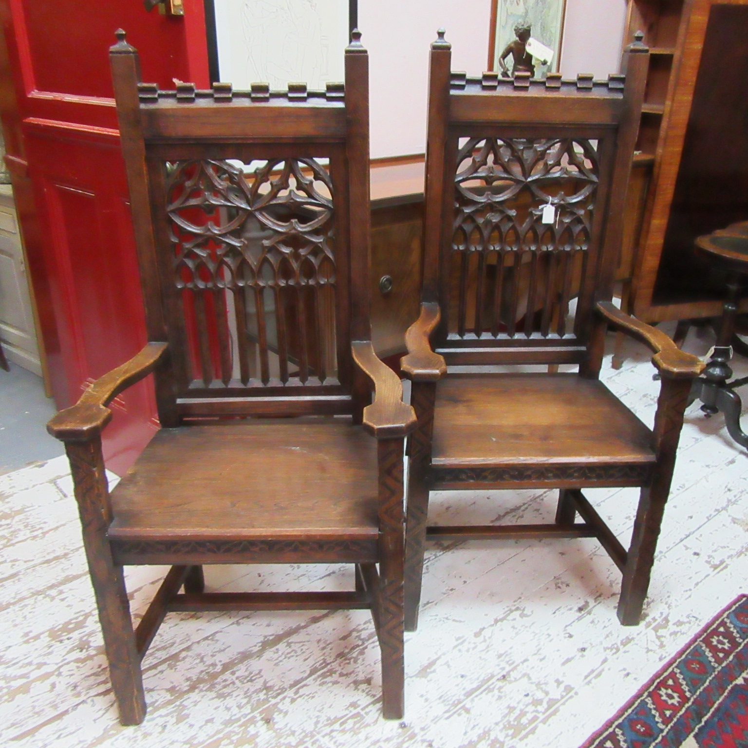 Pair of Antique Oak Gothic Style Hall Chairs c.1900 / 1910