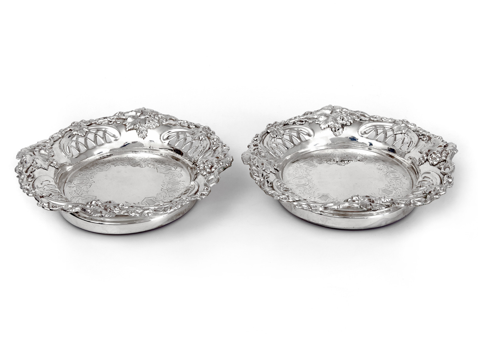 Pair of Antique Silver Plated Coasters with Cast Grape & Vine Borders
