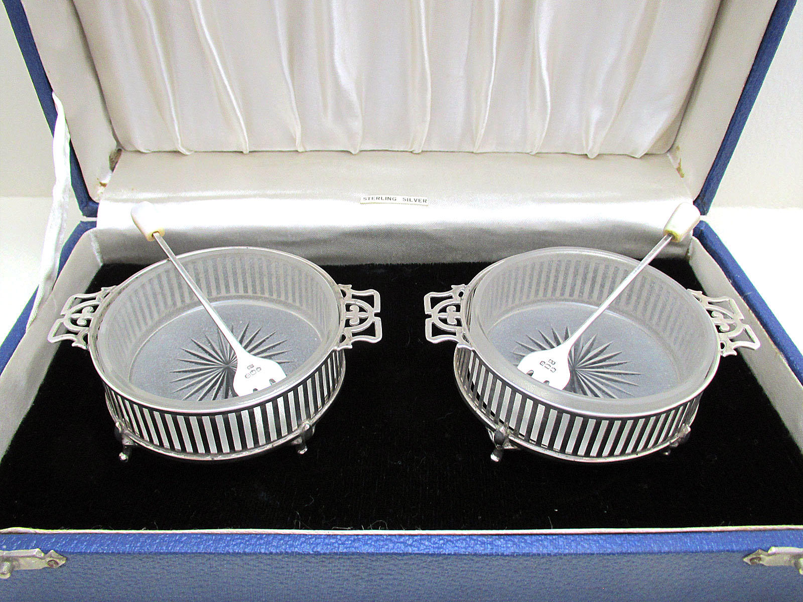 Pair of Antique Solid Sterling Silver & Glass Cased Olive Pickle Salt Dishes Bowl + Forks by Wilson & Sharp. Gift Box 1911