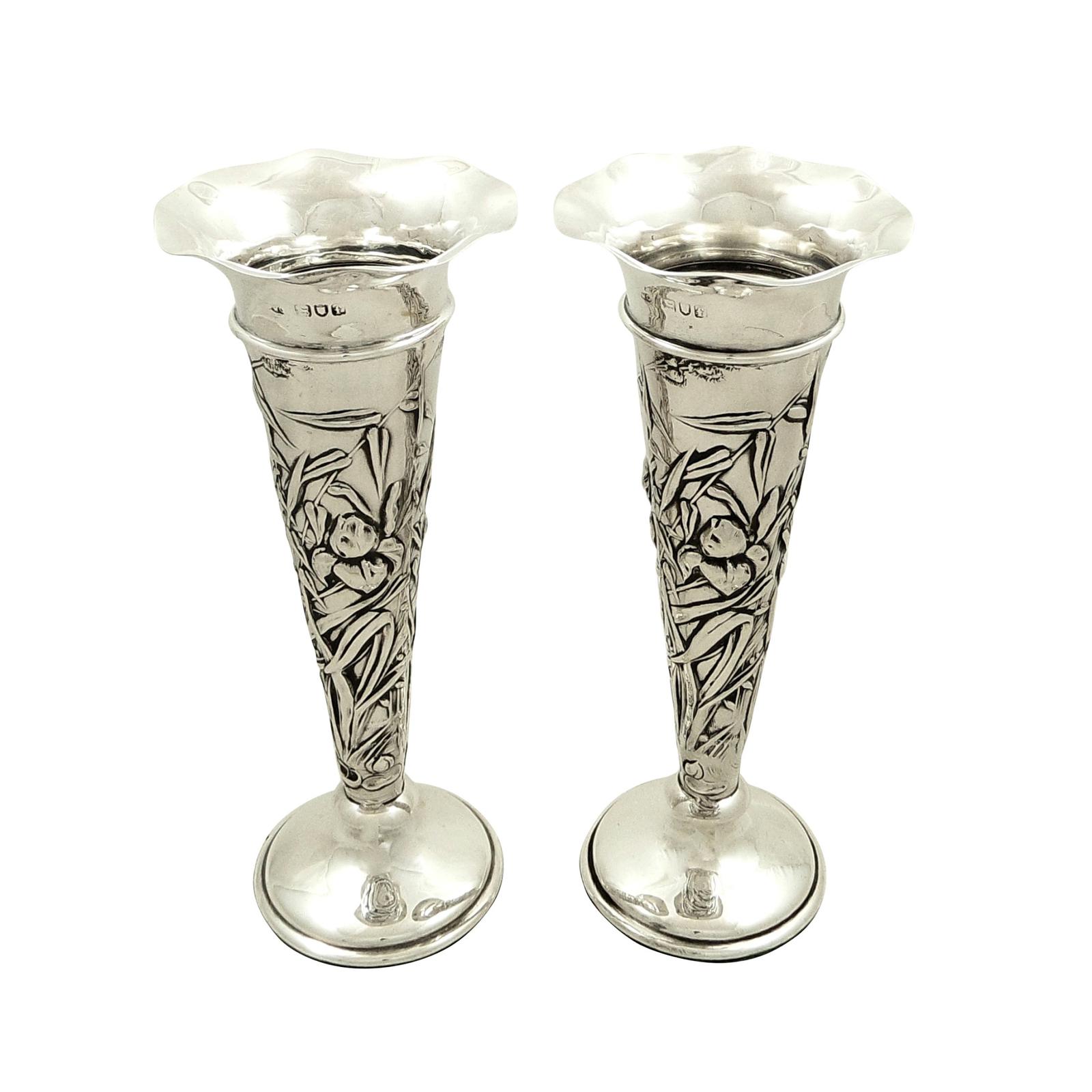 Pair of Antique Sterling Silver 7 1/2" Vases 1901