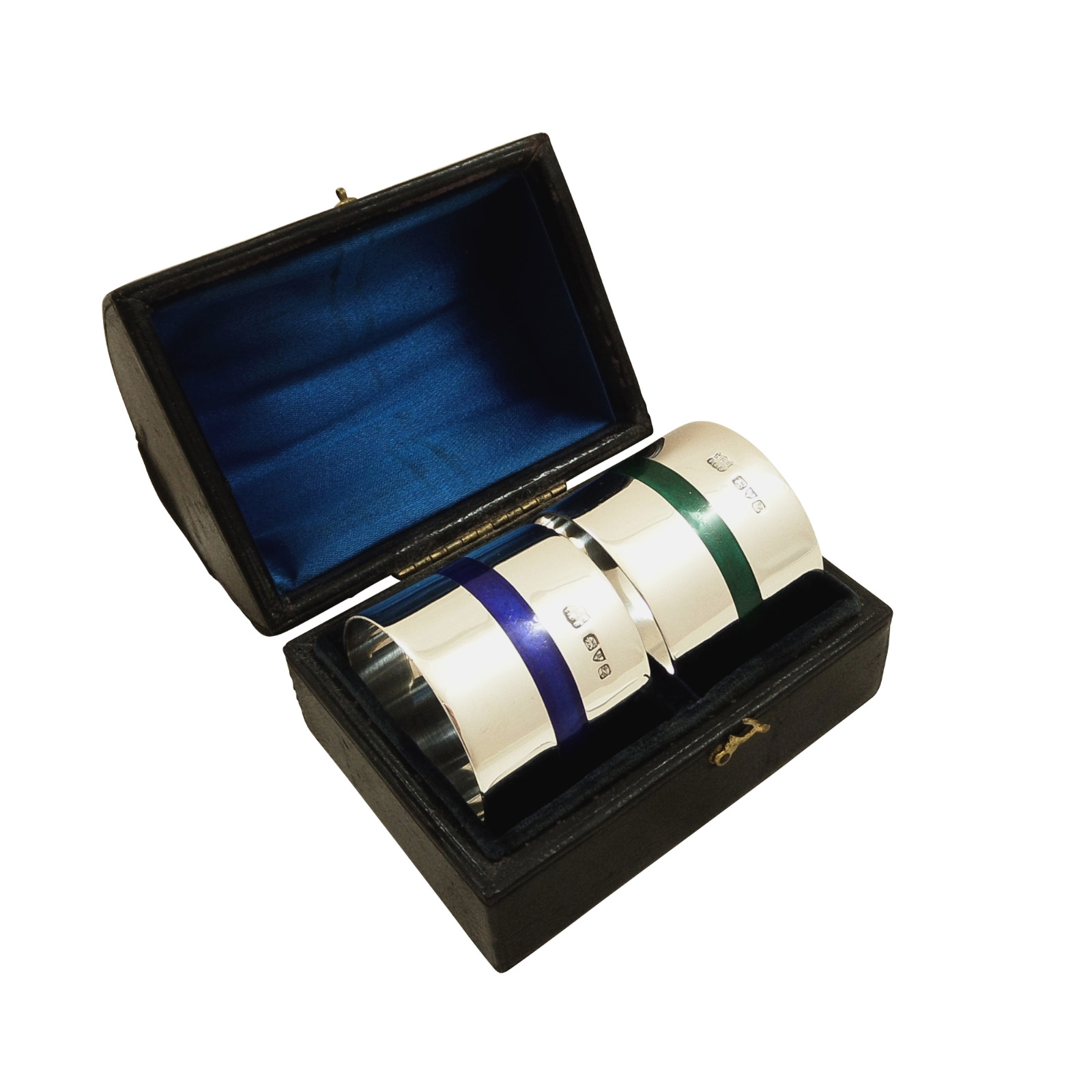 Pair of Antique Sterling Silver & Enamel Napkin Rings in Case 1913