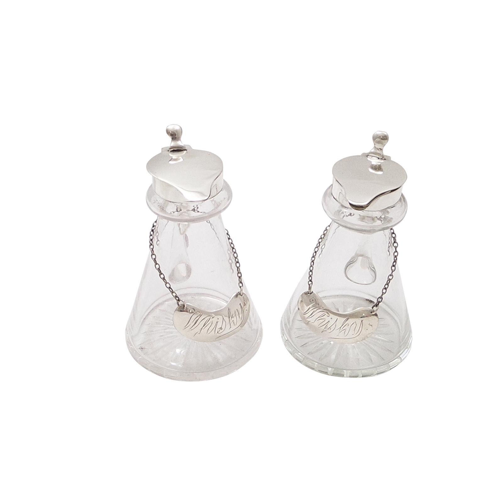 Pair of Antique Sterling Silver & Glass Whisky Jugs / Noggins 1934