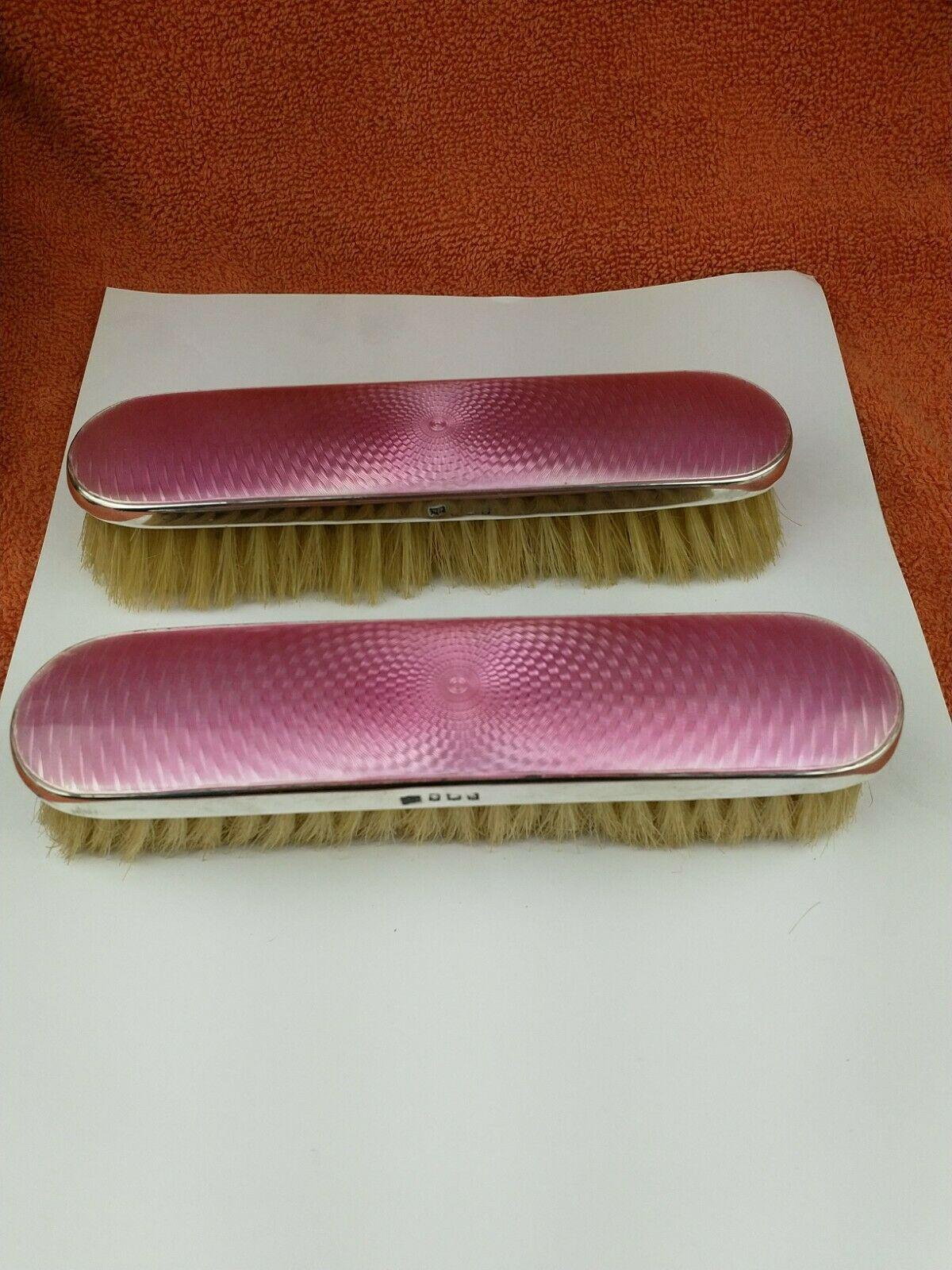 Pair of Antique Sterling Silver Hallmarked Pink Deco Guilloche Enamel Brushes