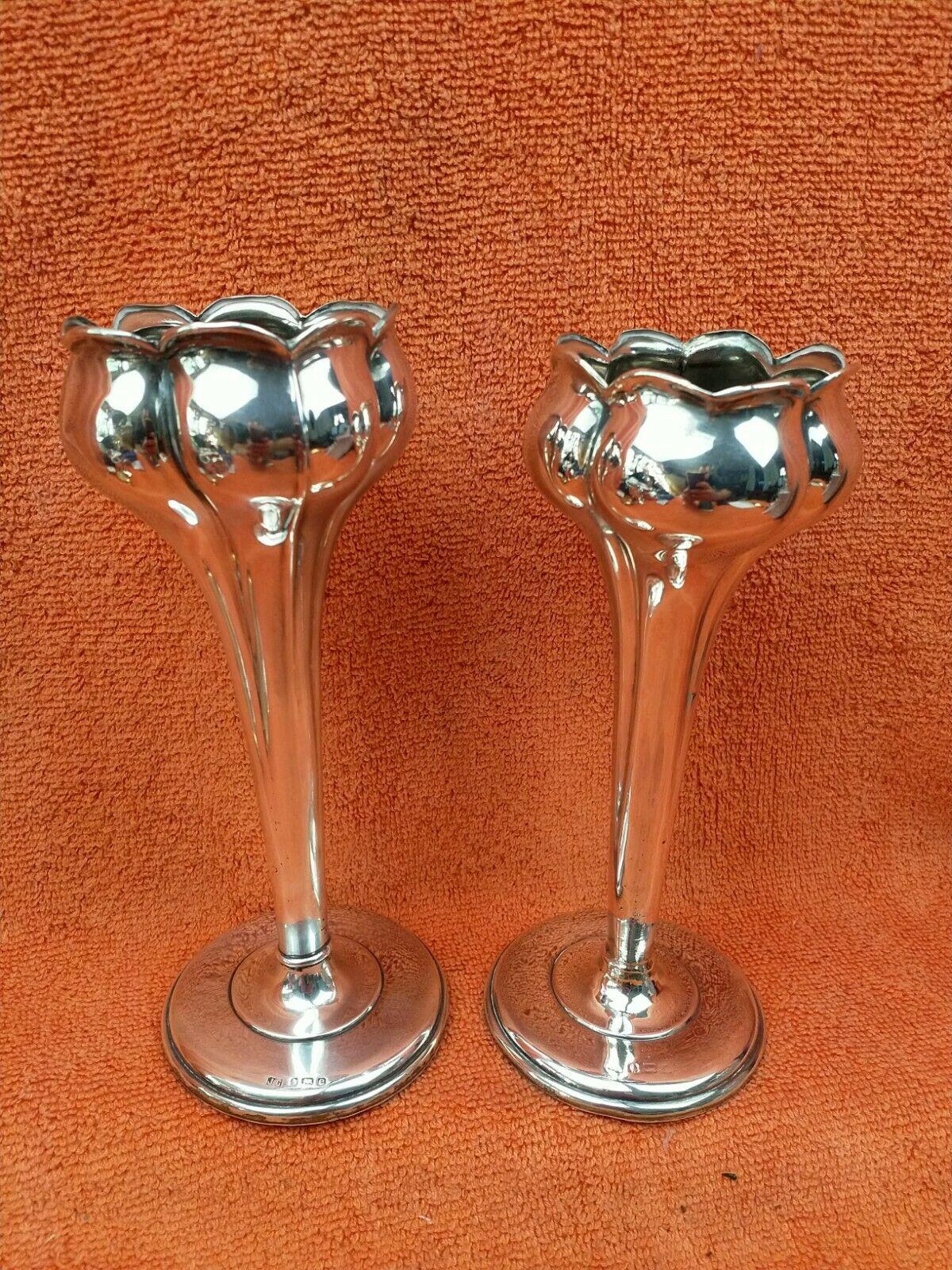 Pair of Antique Sterling Silver Hallmarked Tulip Vases 5 Inch 1904 Joseph Gloster