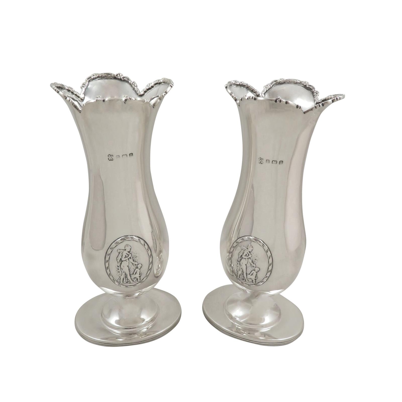 Pair of Antique Sterling Silver Vases - Mother & Child Scene 1912