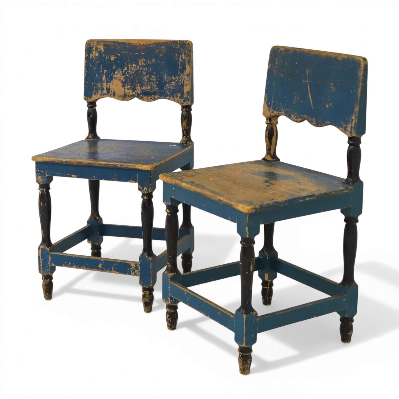 Pair of early 20th‑century Swedish chairs with beautifully worn blue paint, simple folk form and authentic rustic character