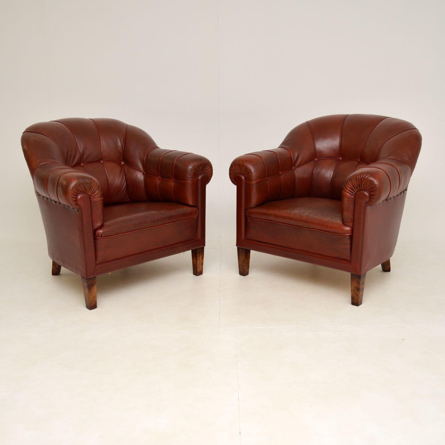 Pair of Antique Swedish Leather Club Armchairs