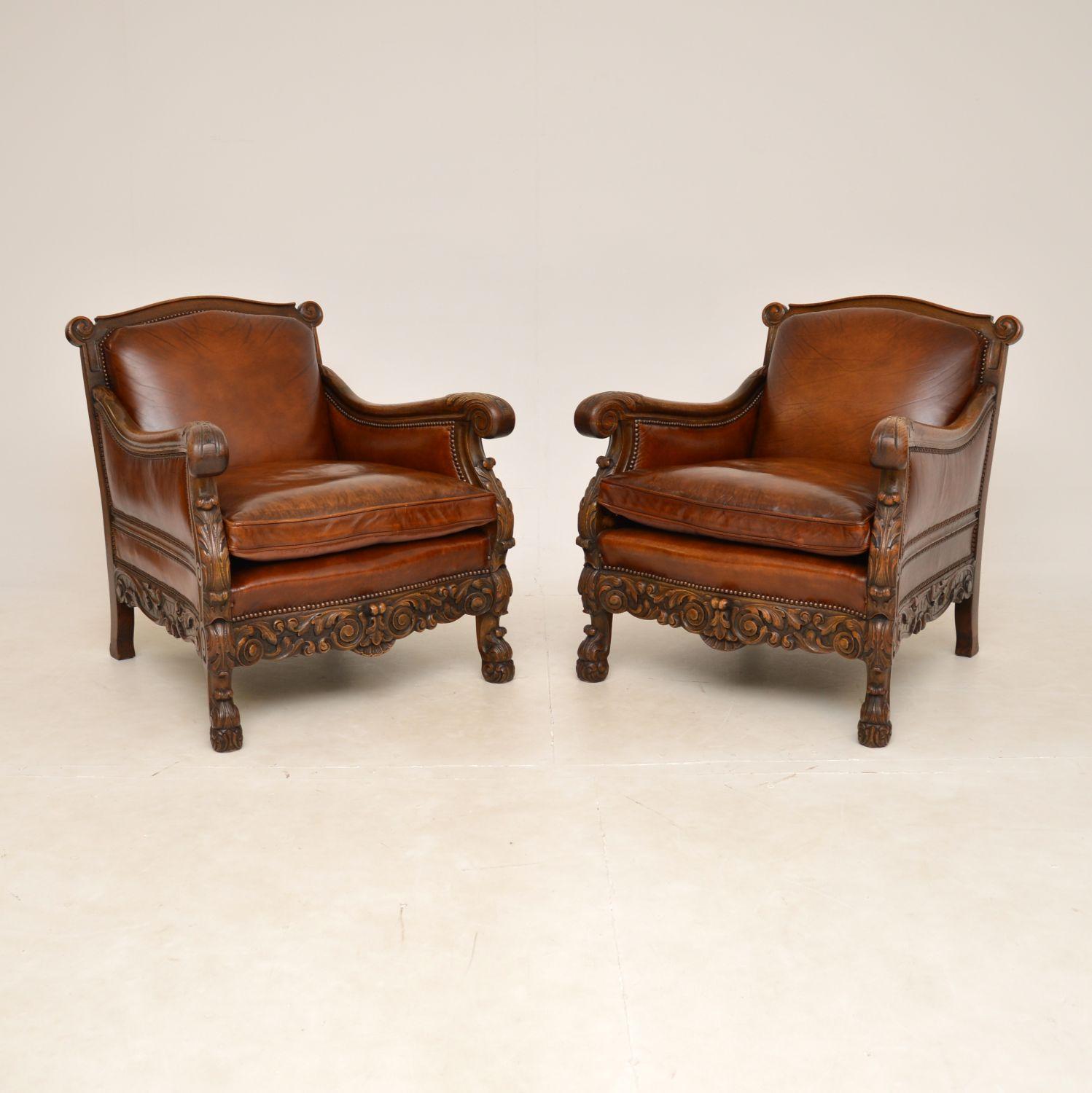 Pair of Antique Swedish Leather & Oak Bergere Armchairs