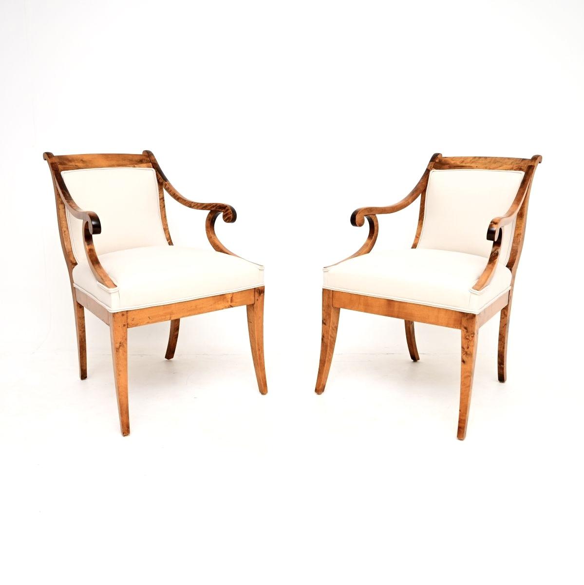 A stunning pair of antique Swedish satin birch Biedermeier armchairs. They were recently imported from Sweden, and they date from around the 1860-1880 period.