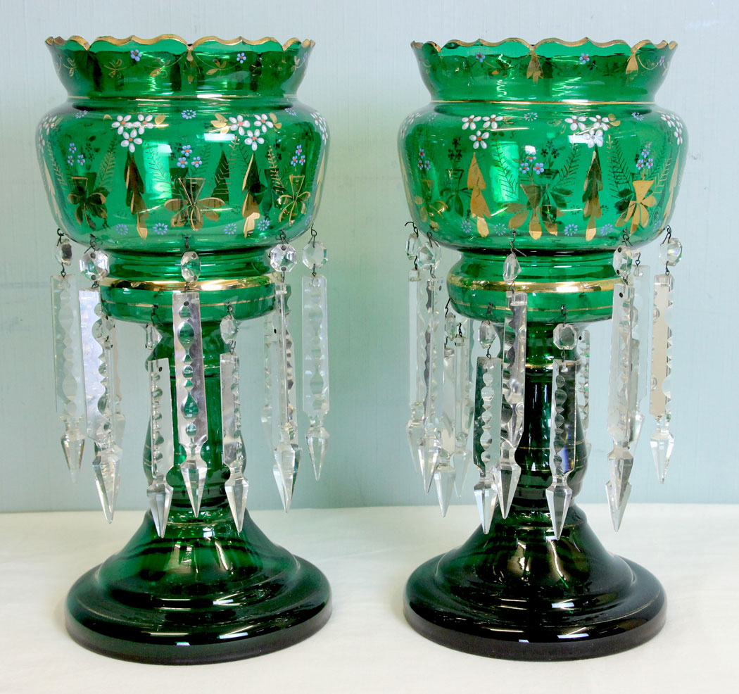 Pair of Antique Victorian Green Table / Mantle Lustre Vases