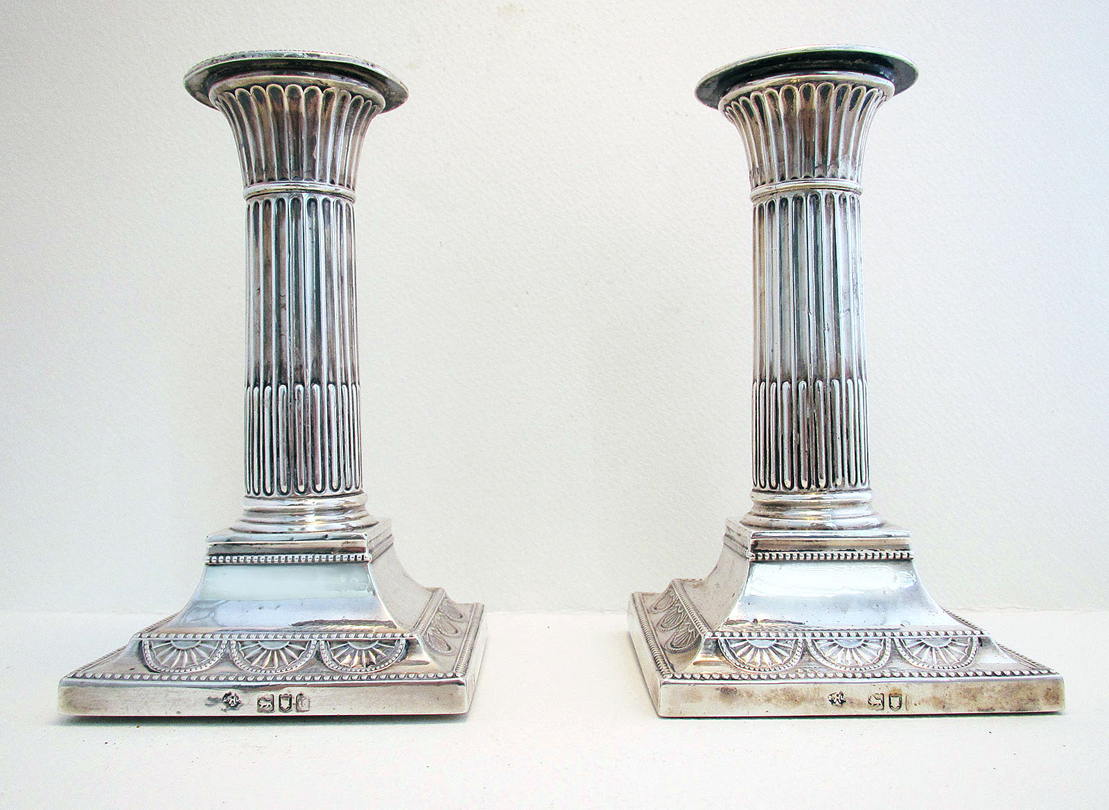 Pair of Antique Victorian Solid Sterling Silver English Corinthian Column Candle Holder Candlesticks. 5 1/2' Tall 1898