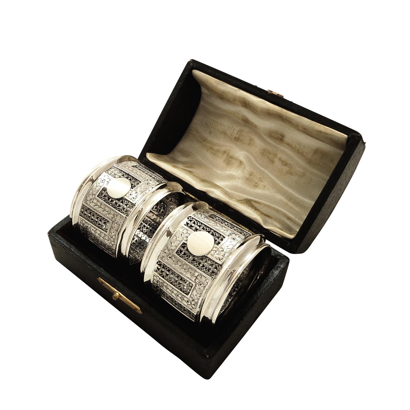 Pair of Antique Victorian Sterling Silver Filigree Napkin Rings in Case 1890