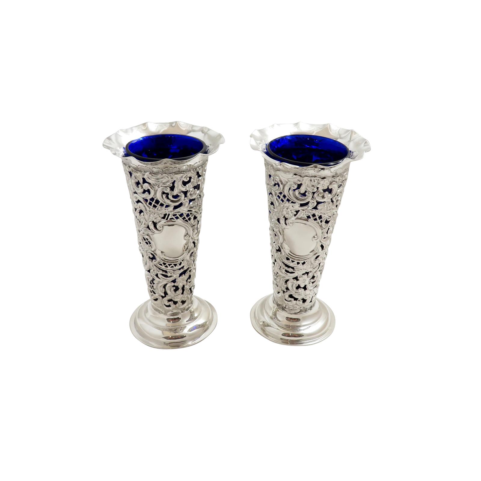 Pair of Antique Victorian Sterling Silver Vases with Liners 1898/1899