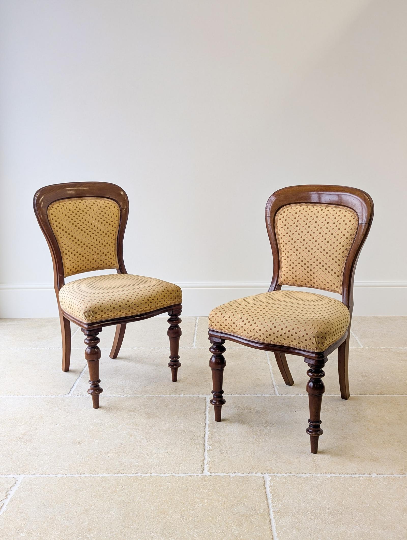A good pair of Victorian walnut side chairs, with finely shaped upholstered backs framed by well figured frames over serpentine upholstered seats, all raised on baluster and ring turned front legs.