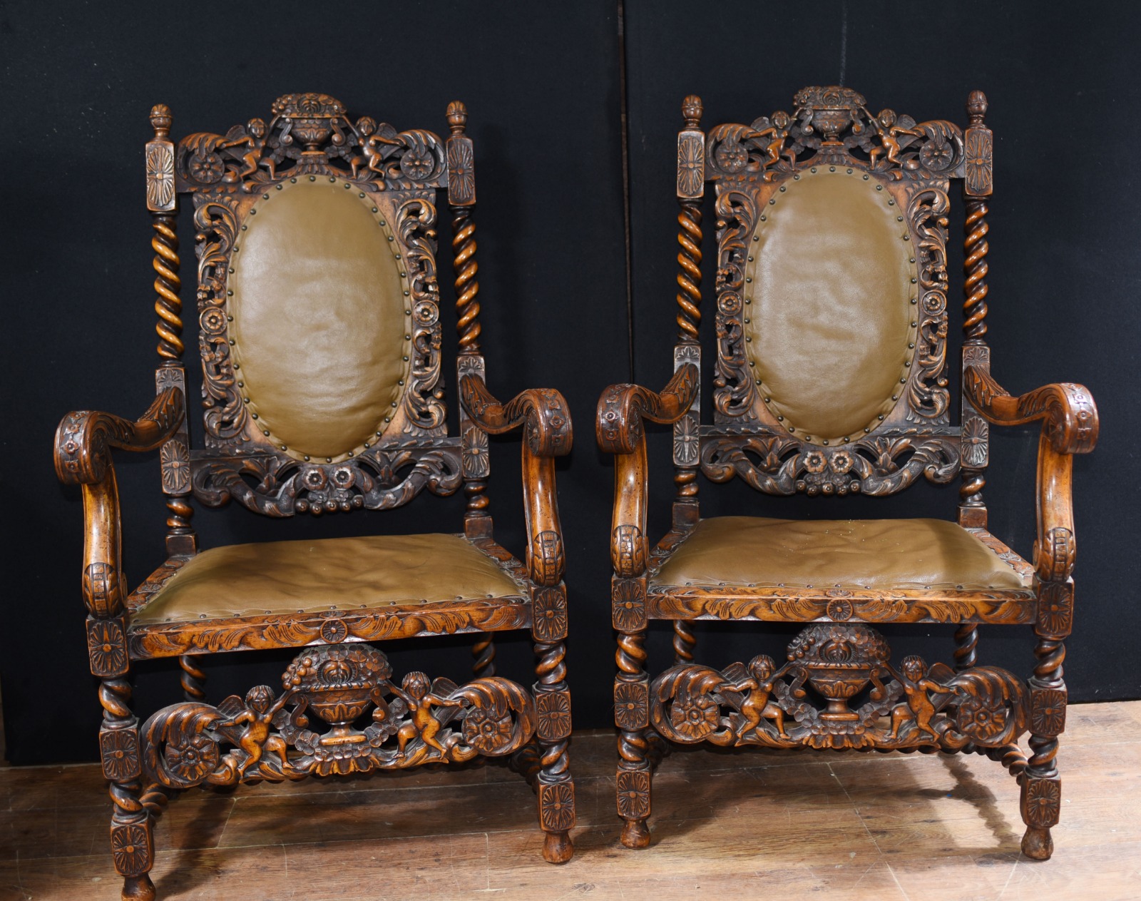 Pair of Antique Walnut Arm Chairs - Carved Barley Twist Farmhouse