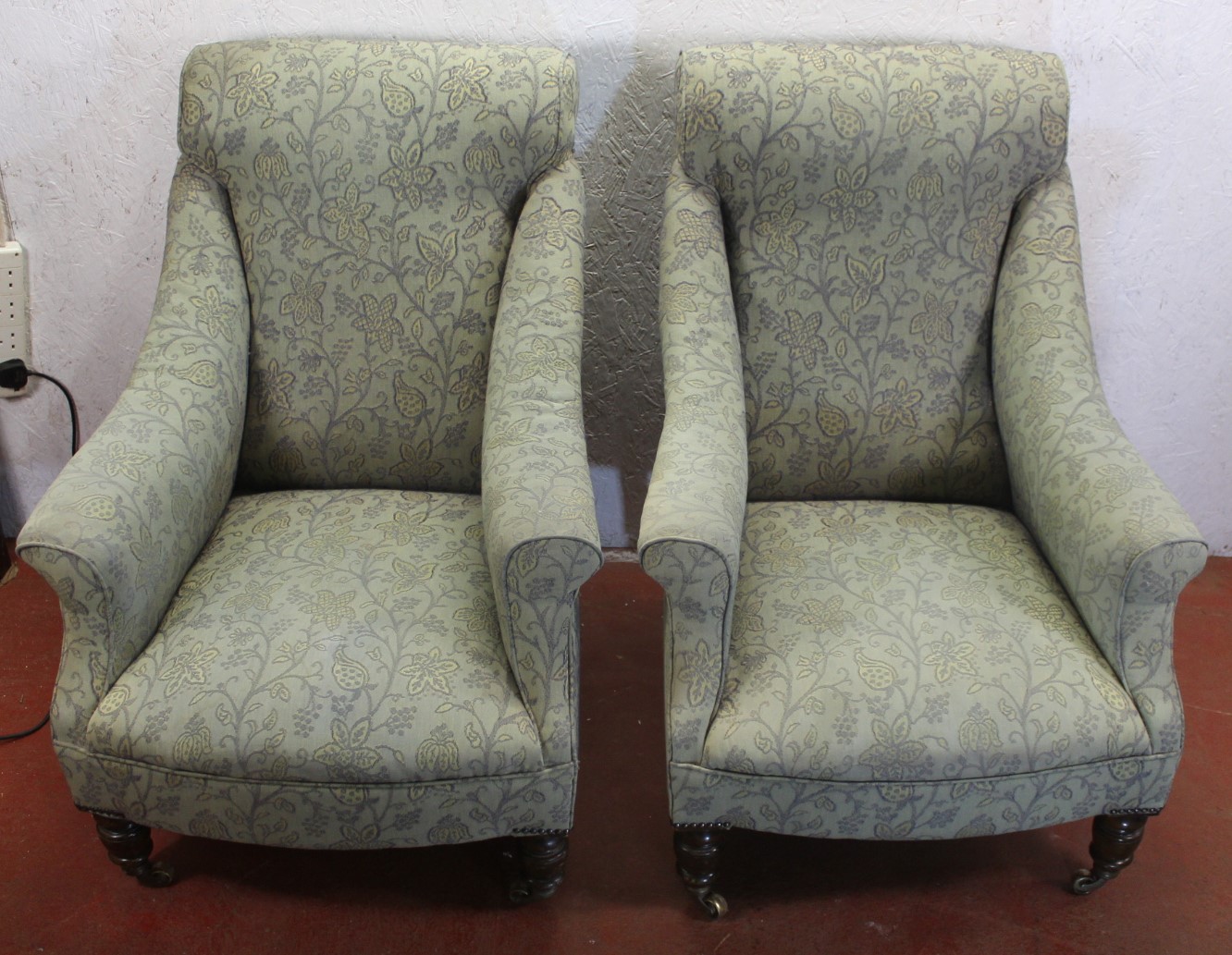 Pair of Armchairs Upholstered in Grey / Green Floral. Good Shape