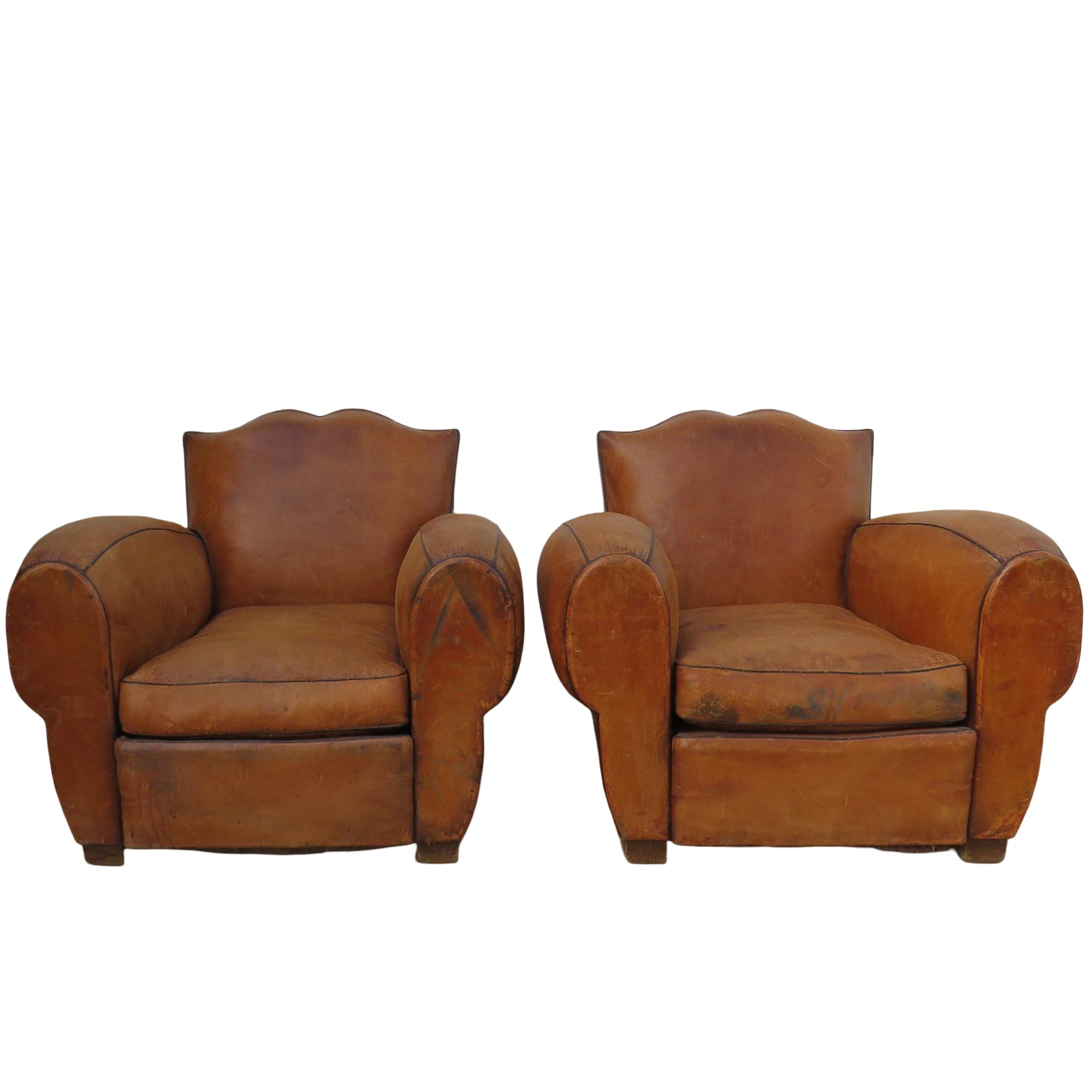 Pair Of Art Deco French Moustache Back Leather Club Chairs