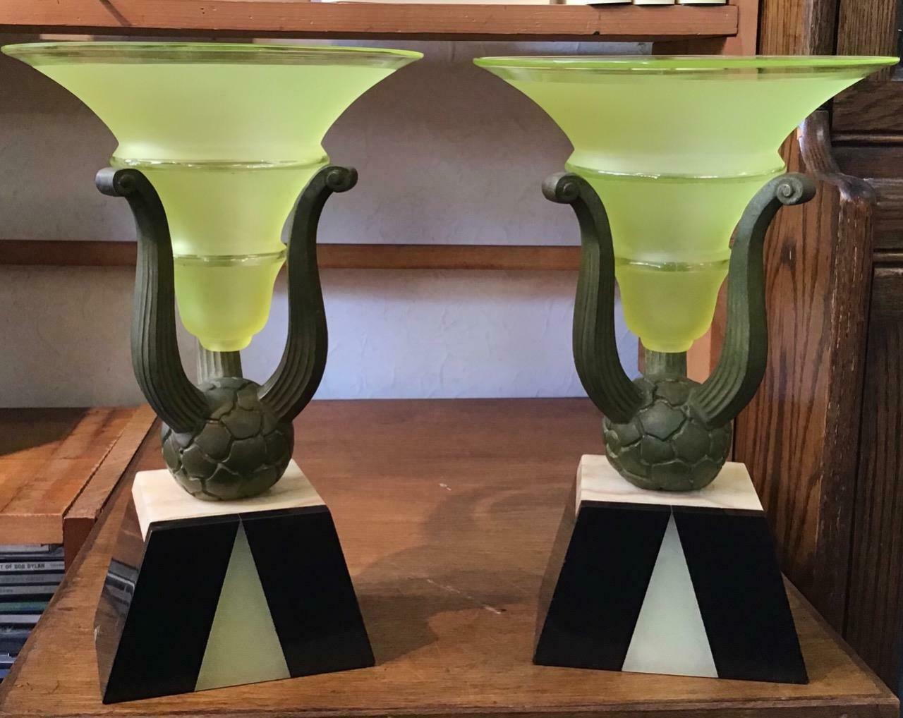Pair of Art Deco Vases, Green Glass & Marble (1 of 1)