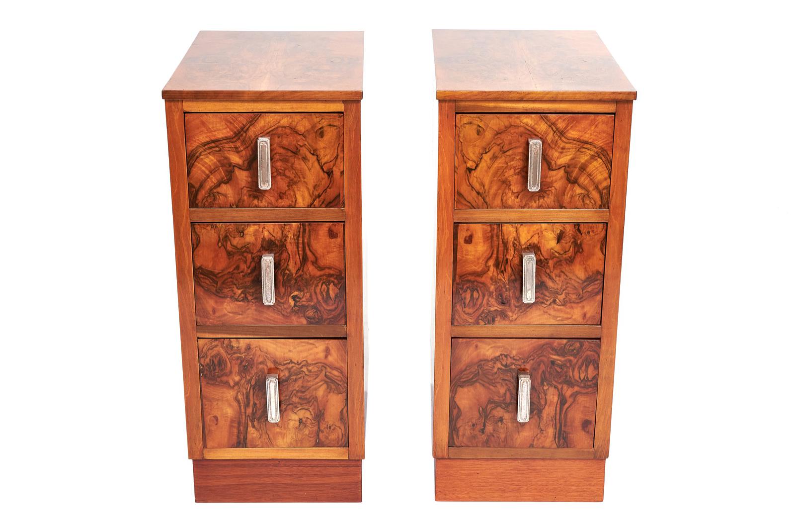 Pair of Art Deco Walnut 3 Drawer Bedside Chests