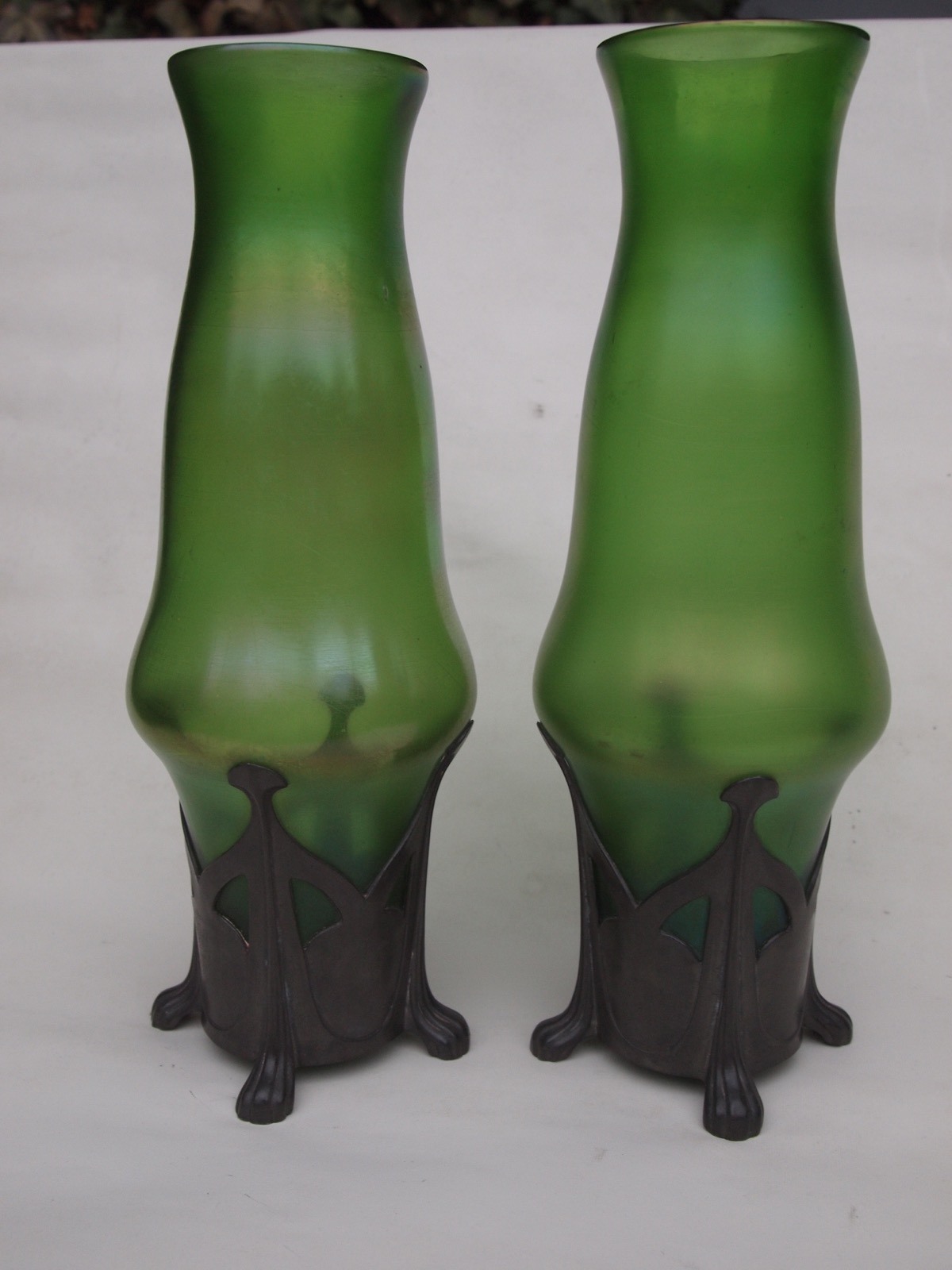 Pair of Art Nouveau Loetz Bronce Glatt Vase in J Reinemann Pewter Stand
