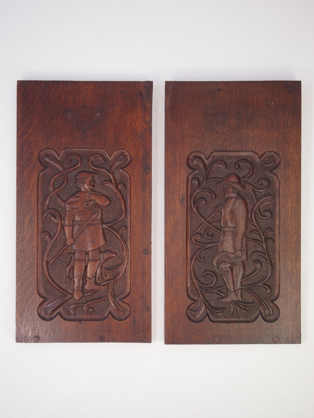 Pair of Arts and Crafts Carved Oak Hanging Panels