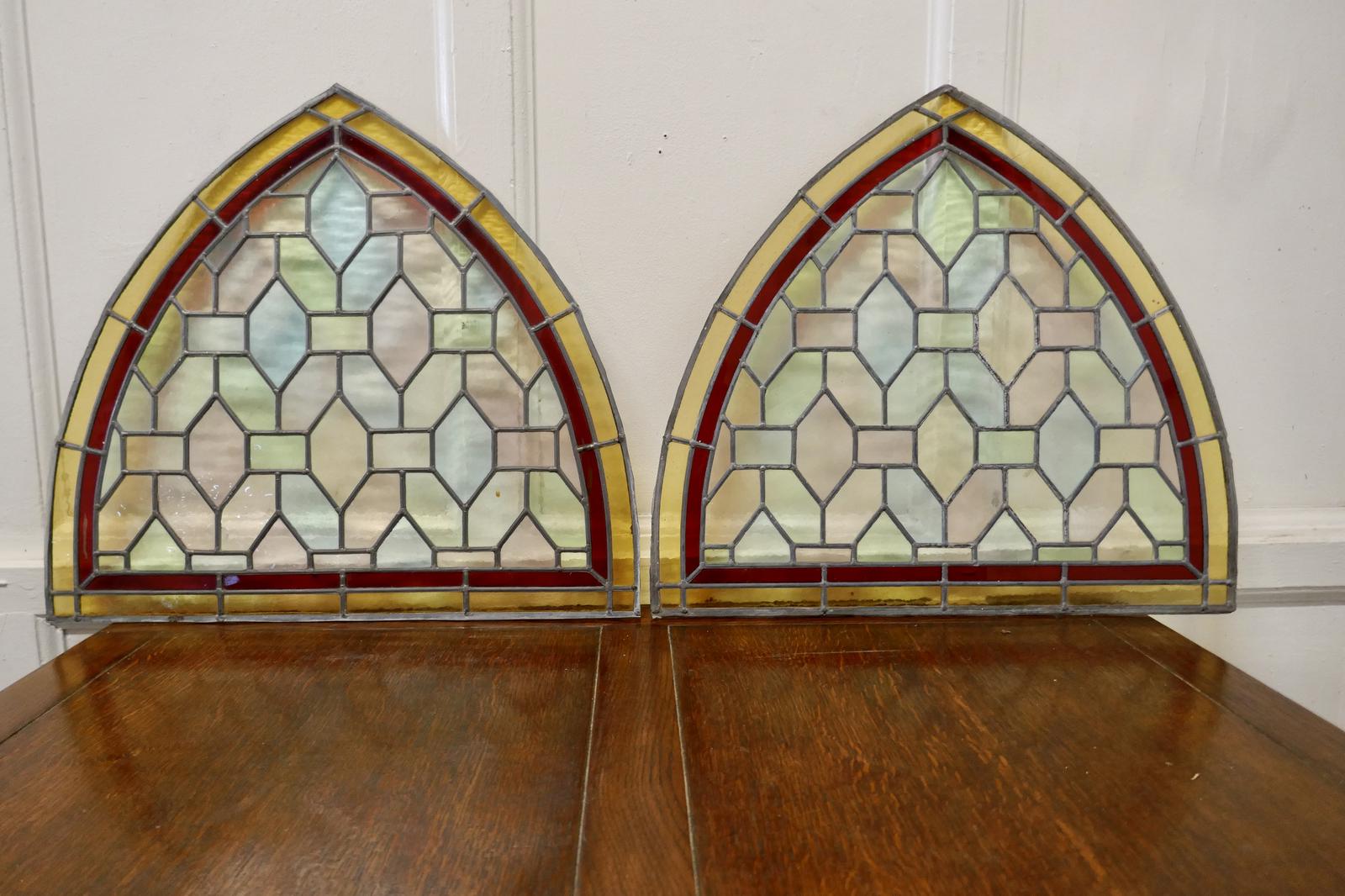 Pair of Arts & Crafts Arched Stained Glass Window Panels