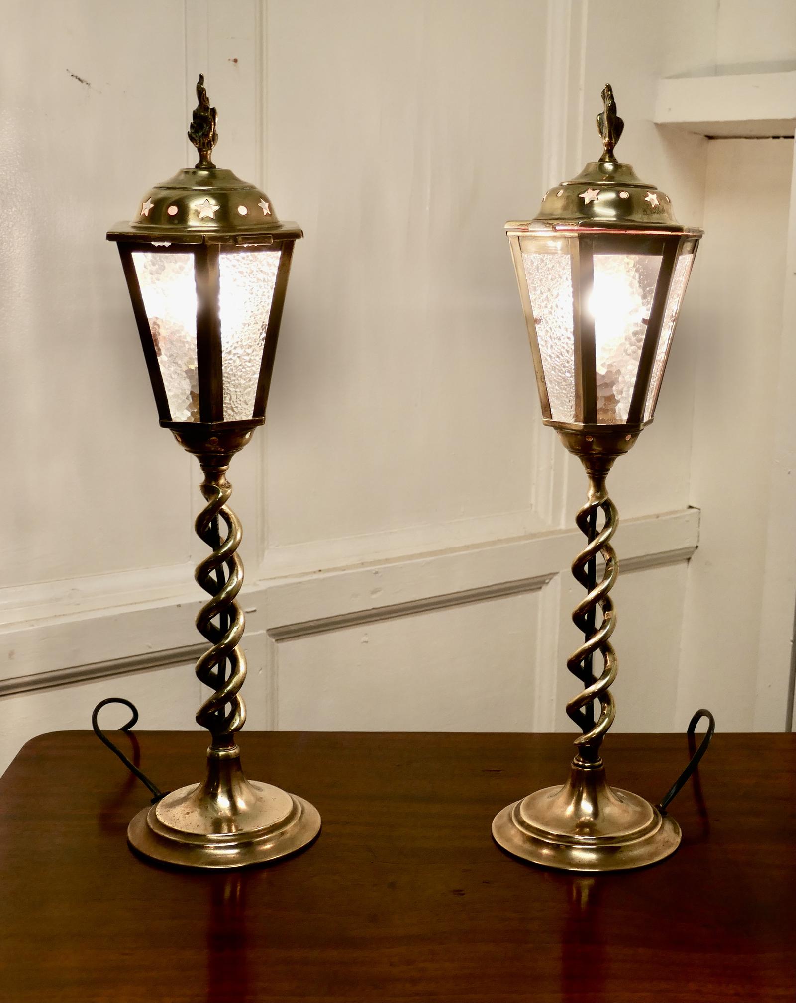 Pair of Arts & Crafts Barley Twist Brass Hall Table Lanterns