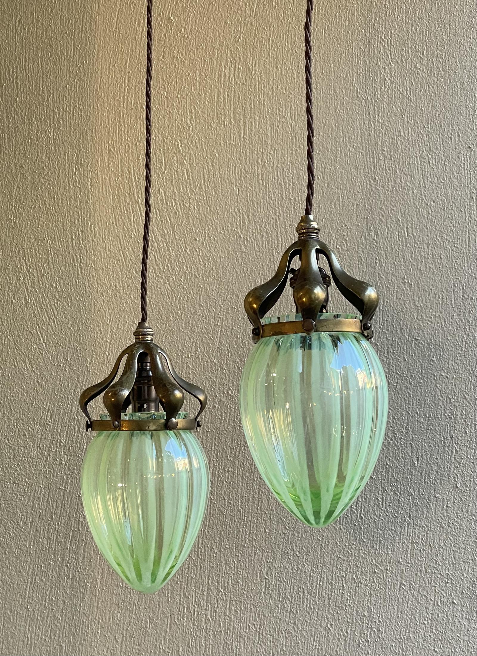 A superb pair of Arts & Crafts patinated brass ceiling pendant lights, with registered design complete with the replacement vaseline glass shades in the manner of WAS Benson. The galleries each stamped with Registered design number: 319979 Fully rewired in period style braided flex and PAT safety tested.