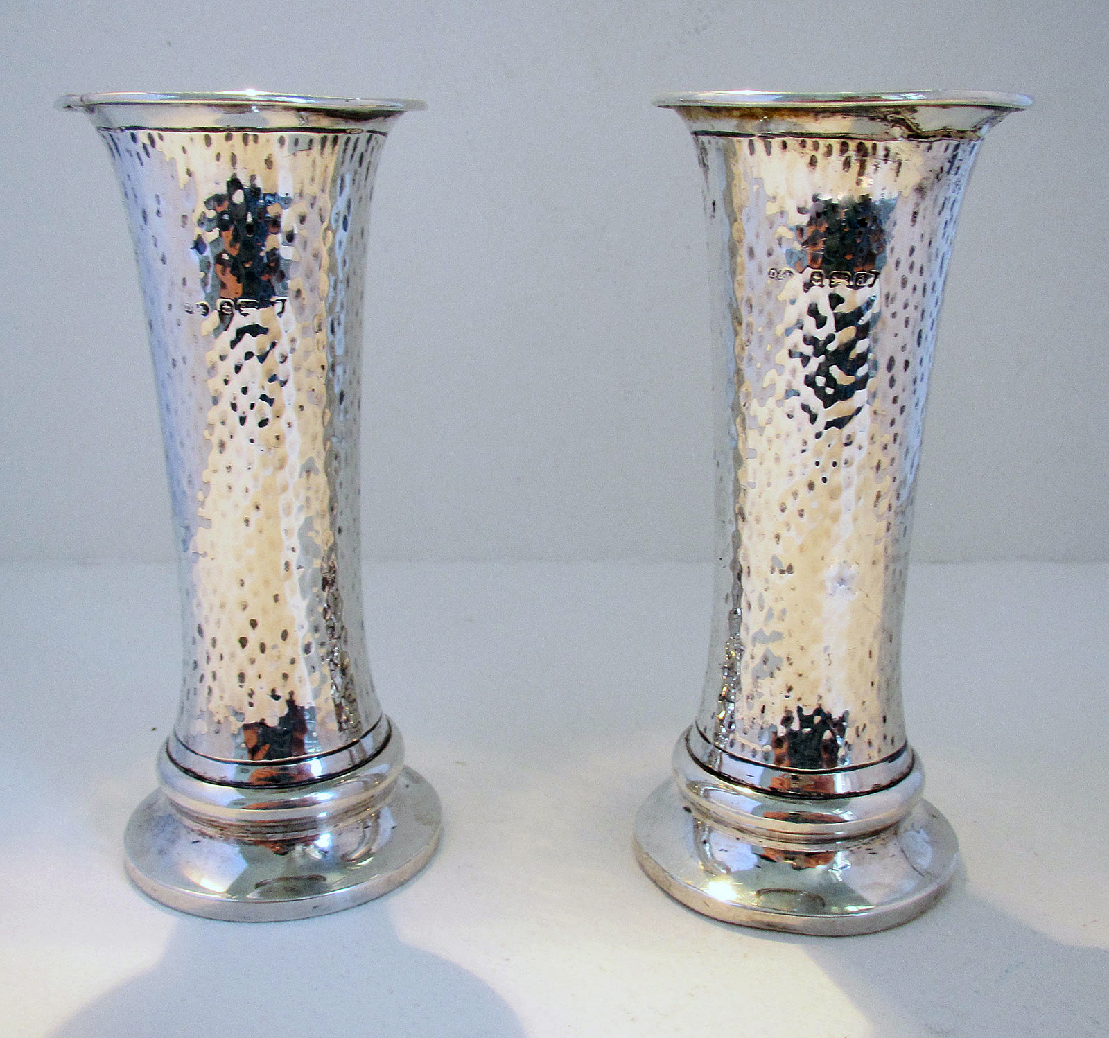 Pair of Beautiful Arts & Crafts Solid Sterling Silver Planished Flower Vases Pots. Antique Edwardian English Hallmarked 1903.