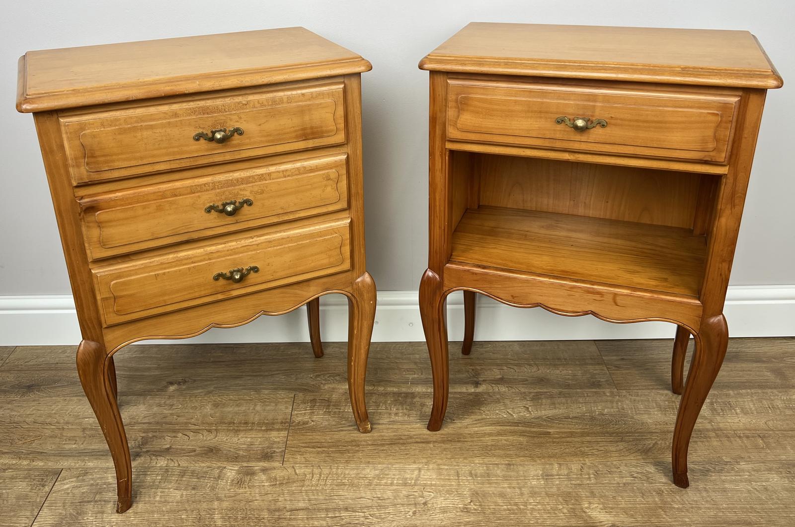 A beautiful set of Vintage French Louis bedside tables, combining elegant curves with practical design. This charming pair features one cabinet with three drawers and a matching piece with a drawer and open shelf, creating a balanced and versatile bedside arrangement. Offered in good condition – a lovely vintage set with attractive character and charm.